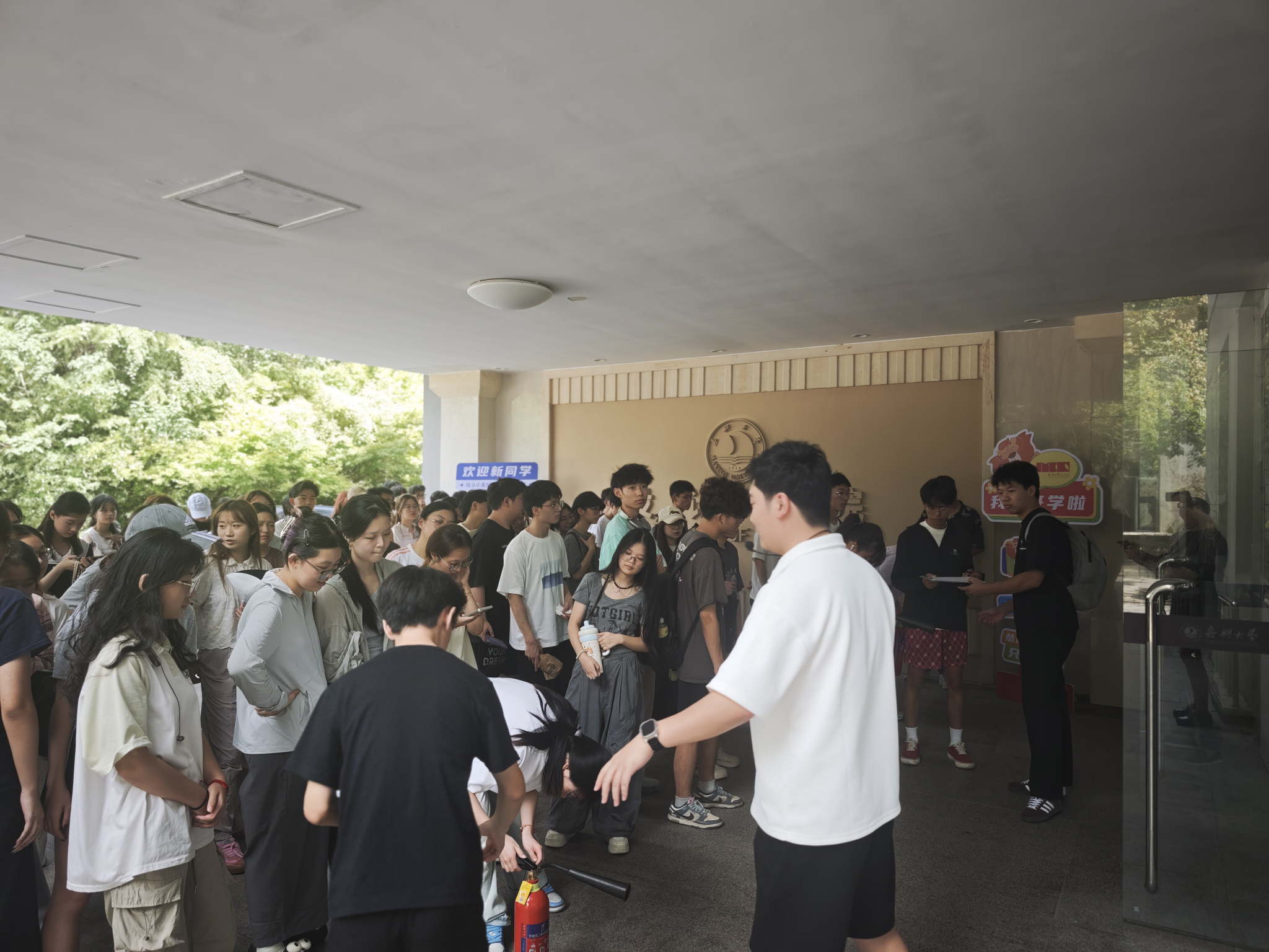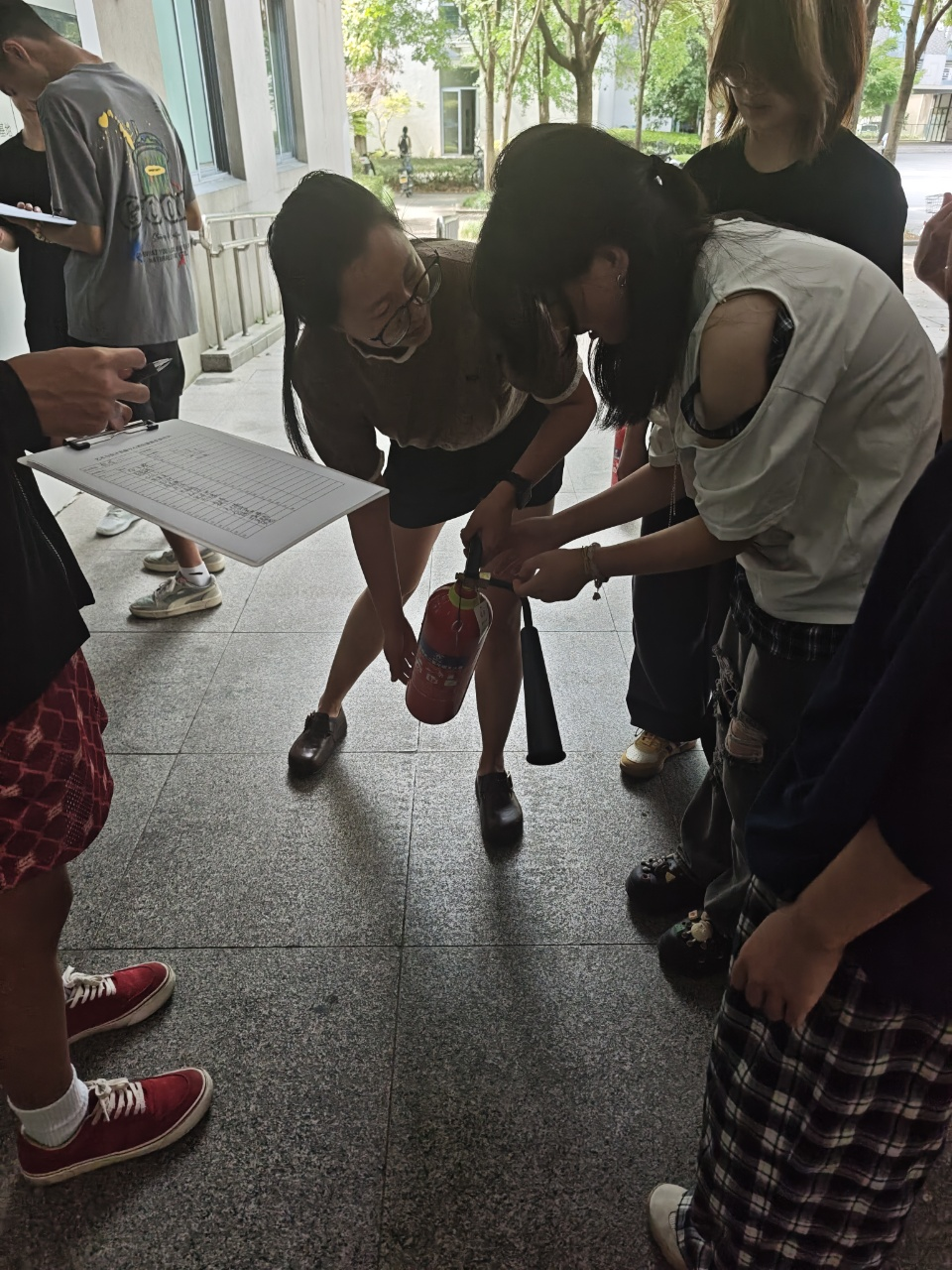 实操演练环节是本次培训的重点。在实验中心专属演练场地,现场演示了灭火器的构造、工作原理及 “提、拔、握、压” 四步操作法,手把手指导每位新生进行灭火实操。从灭火器的正确拿取姿势,到火源瞄准位置的精准把控,教师们逐一纠正操作误区,确保每位新生都能熟练掌握灭火技能,真正做到 “学懂、弄通、会用”。