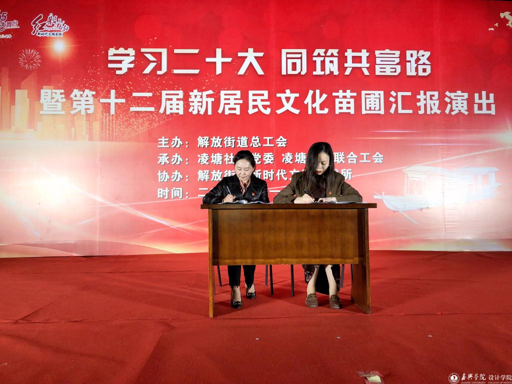 本次活动以《学习二十大,同筑共富梦》为主题,服设员工党支部书记刘洋代表支部认领凌塘社区“巧妇花园”项目,支部将发挥党员专业特长,携手凌塘社区开展社区墙绘、创意设计、艺术支教、关爱老人等志愿活动,共建美丽家园,传播正能量,同筑共富梦。随后,刘洋老师与凌塘社区党委书记徐惠琴签订共建协议,双方将以政治建设为统领,融合双方资源创新组织开展理论联学、活动联办、品牌联创等,进一步提升党组织引领力、组织力和服务力。