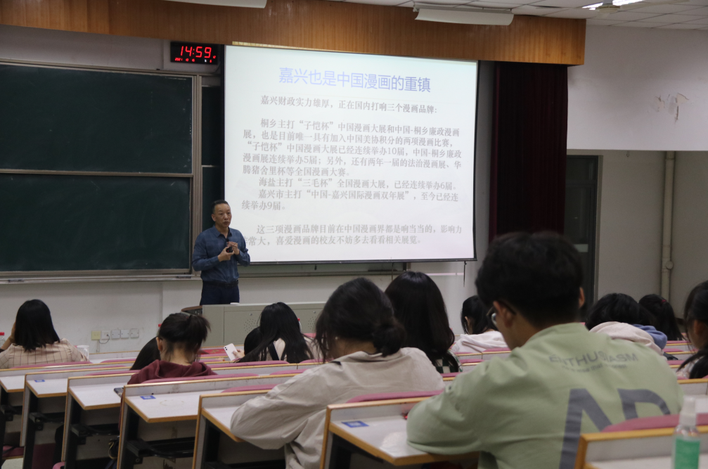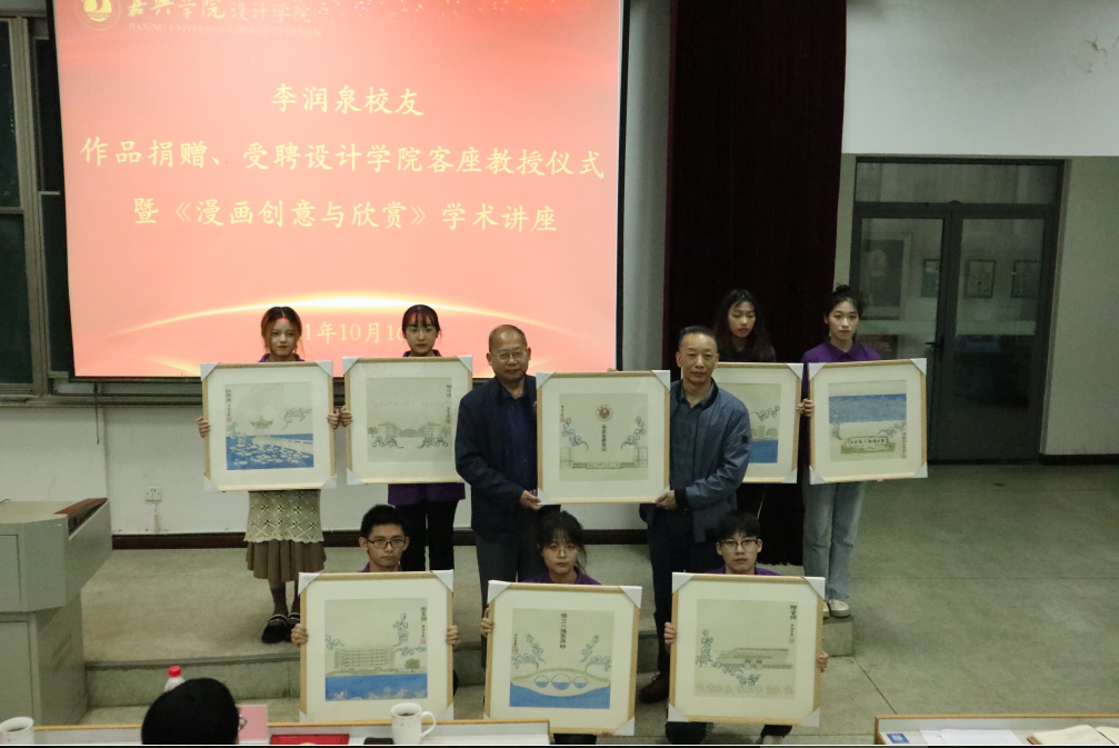 捐赠和聘任仪式后,李润泉员工以永利yl23411官网客座教授身份进行了首场题为《漫画创意与欣赏》学术讲座。他向大家介绍了漫画的基本概念和中国近现代的漫画名家,解释了漫画创意从何而来,讲解了如何欣赏漫画,并分享了自身漫画创作和加入中国美术家协会的心路历程。给出了美术创作“净、镜、静、敬、境”五点建议。