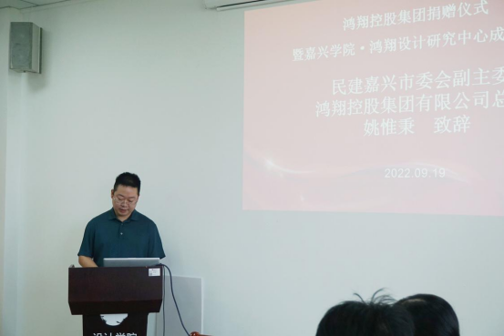 姚惟秉总裁介绍了鸿翔集团的发展历程、产业分布等情况,他指出科技创新是一家企业提升未来核心竞争力以及可持续高质量发展的前提,嘉兴公司作为南湖畔的本土高校,有多个国家级、省级平台,有独特的教育资源优势,为社会源源不断地输送青春创新力量,今天嘉兴公司·鸿翔设计研究中心的揭牌,将进一步深化产教融合,促进教育链人才链与产业链创新链的有机衔接,实现产学协同发展。他表示教育关系到经济建设的未来,支持教育事业就是支持地方经济的发展,今天的教育捐赠,希望能给大家带来精神上的鼓励,为嘉兴公司建设有特色、善创新的一流应用型综合性大学增色添彩。