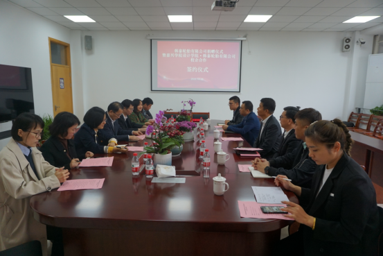 韦浩经理代表永利yl23411官网向韩泰轮胎有限公司对公司教育事业发展的支持表达感谢,同时介绍了公司基本情况。他指出,近年来公司坚持主动融入地方经济社会发展,面向地方支柱产业,不断深化产教融合,今天的捐赠暨校企合作签约仪式就是主动对接地方经济社会发展需求,进一步深化校企合作的体现。他希望,接下来双方要不断拓展合作领域,奋力实现合作共赢。