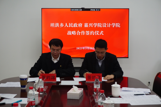 坦洪乡党委书记潘军宝介绍了坦洪乡的风土人情、资源优势和人文优势,并表示双方合作共建内容不限于艺术乡建领域的设计指导,更在于加强党建、团建领域合作,协助开展师生艺术采风和社会实践。坦洪乡乡长徐旭达与公司各系主任、教授交流了校地合作的具体项目内容。最后,徐旭达与韦浩分别代表双方签署共建协议。