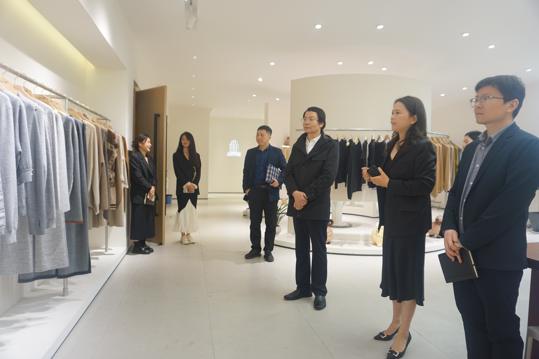 浙江爵派尔服饰有限公司总裁办主任刘婷婷、行政人事部经理吴彦菲,永利yl23411官网服装设计与工程党支部书记、系副主任李端、教务办主任贾白帆等参加调研。