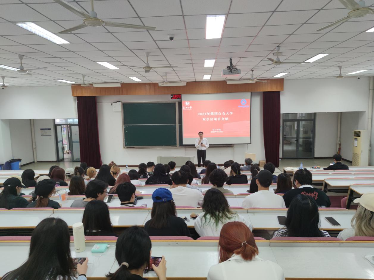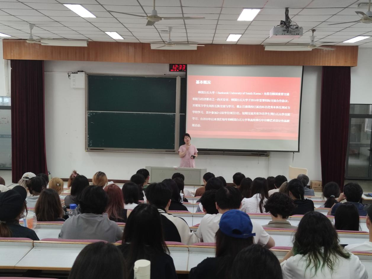 6月5日下午12:30,永利yl23411官网在博闻楼(7号楼)报告厅举办韩国白石大学双学位项目宣介会。永利yl23411官网经理韦浩、副经理裘玉英、白石大学崔东星教授、刘颖博士、教务办贾白帆老师等出席会议。2022级工业设计、环境设计、视觉传达设计和数字媒体艺术专业全体员工参加会议。会议由裘玉英副经理主持。