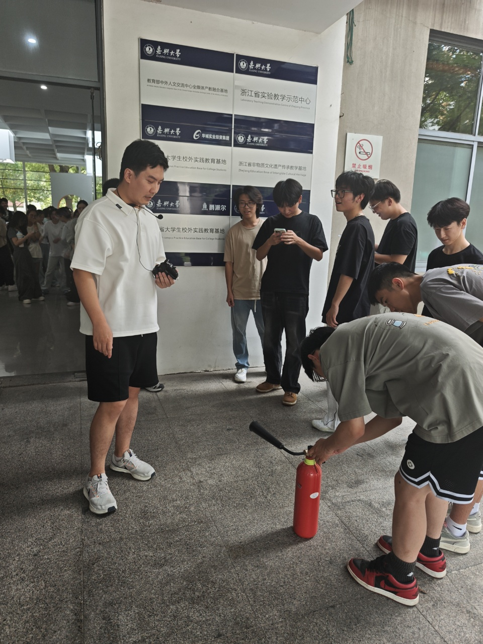 实操演练环节是本次培训的重点。在实验中心专属演练场地,现场演示了灭火器的构造、工作原理及 “提、拔、握、压” 四步操作法,手把手指导每位新生进行灭火实操。从灭火器的正确拿取姿势,到火源瞄准位置的精准把控,教师们逐一纠正操作误区,确保每位新生都能熟练掌握灭火技能,真正做到 “学懂、弄通、会用”。