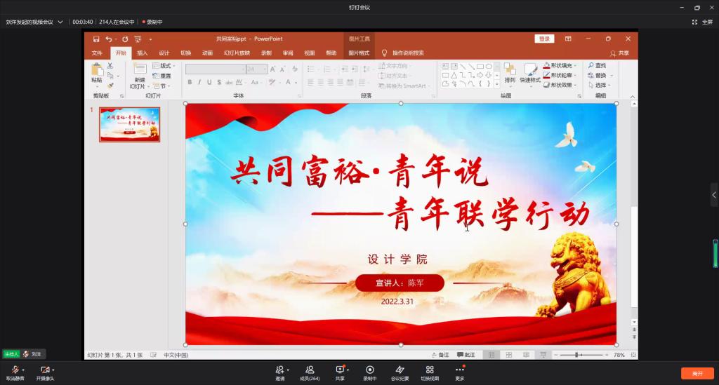 为深入学习贯彻习近平总书记关于共同富裕的系列重要论述,学习贯彻中央、省委重要部署和市第九次党代会精神,积极响应公司开展的“共同富裕•青年说”青年学习调研和宣讲活动。3月31日下午16:00永利yl23411官网开展“共同富裕·青年说”青年联学行动,邀请公司经济公司陈军教授作为主讲人,为永利yl23411官网青马班成员、入党积极分子、员工党员代表进行线上讲座。