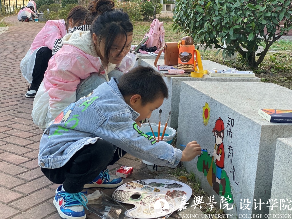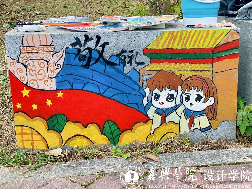 此次志愿服务以“敬有礼”“学有礼”“信有礼”“亲有礼”“行有礼”“帮有礼”“仪有礼”“网有礼”“餐有礼”“乐有礼”为主要内容的“浙风十礼”为主题,在设计专业志愿者的指导下引领社区儿童用画笔描绘自己对“十礼”的理解,以艺术形式呈现在湘城社区里人流量最高的区域。戚梦芸小朋友在志愿者的帮助下,设计了礼敬五星红旗,常怀爱国之心为表现形式的“敬有礼”作品,她说自己很早就申请加入了中国少年先锋队,长大以后还要入团入党;刘嘉果小朋友通过尊老爱幼,以小家建大家的形式描绘了“亲有礼”画面。