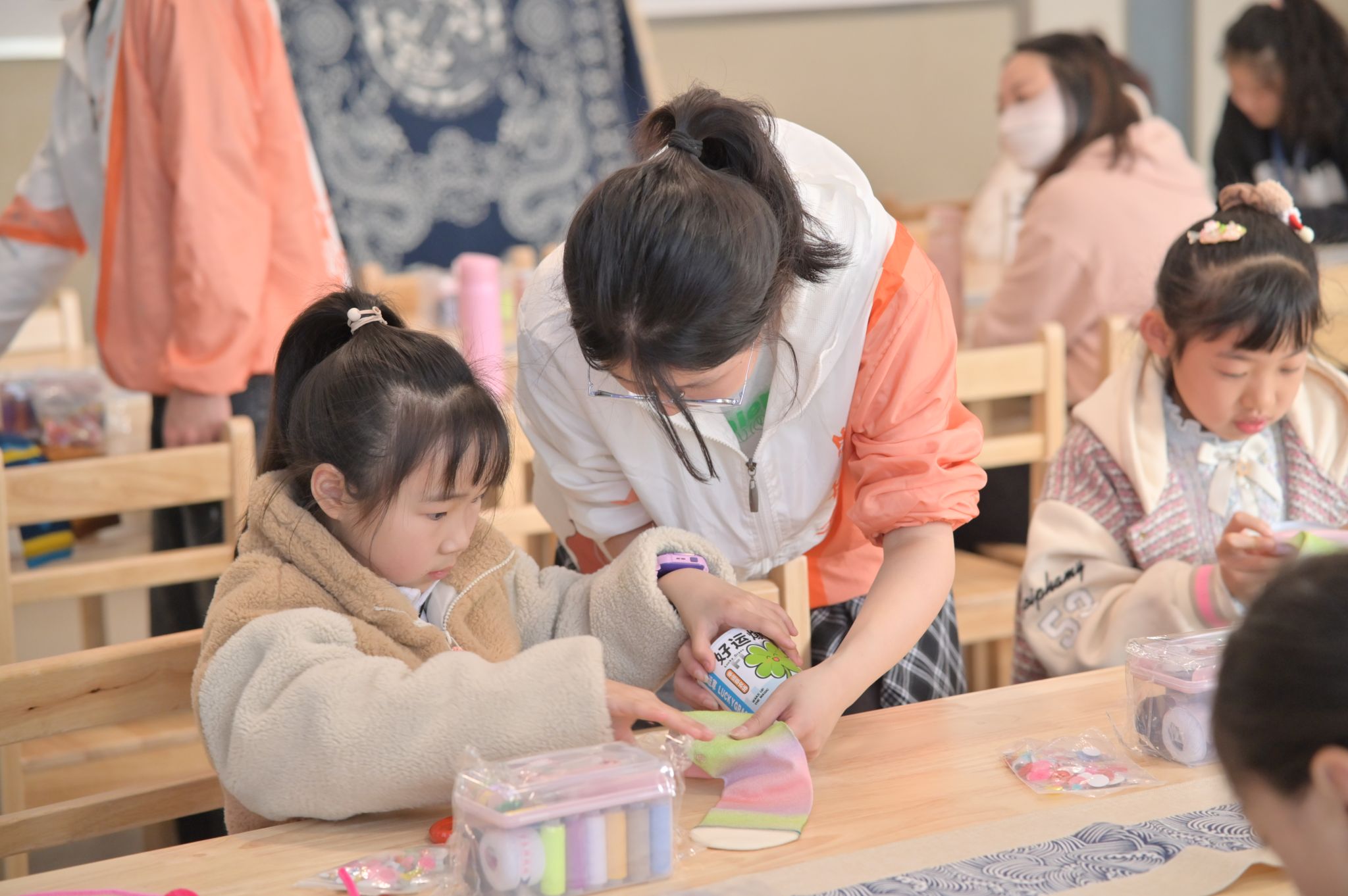 2024年3月23日,永利yl23411官网“绘梦拾光”团队《哇哦,袜偶》公益课程第一讲在嘉兴市青少年宫开课。