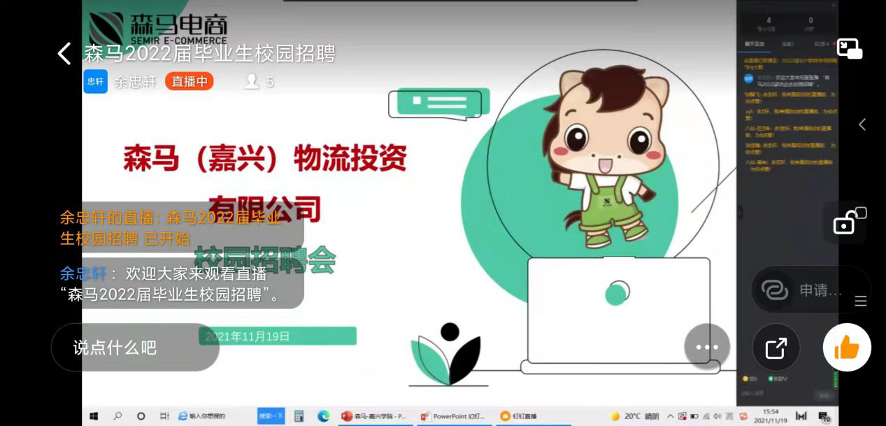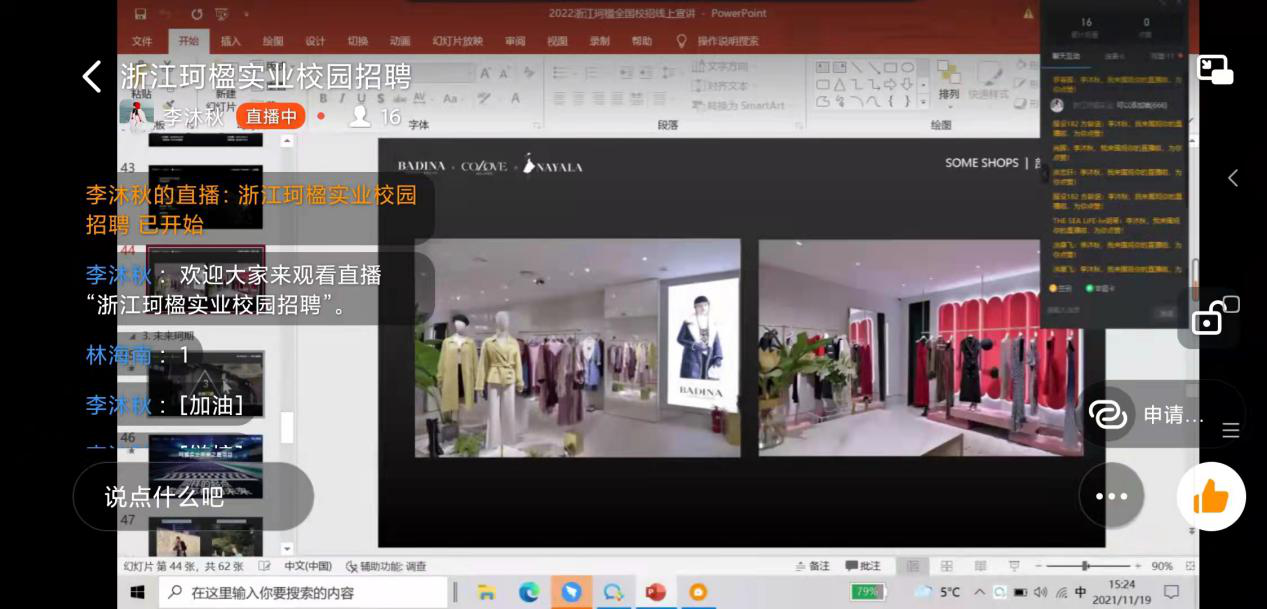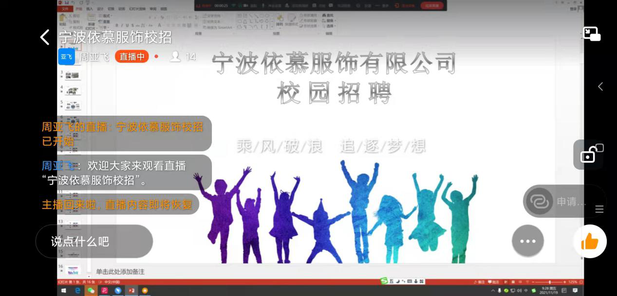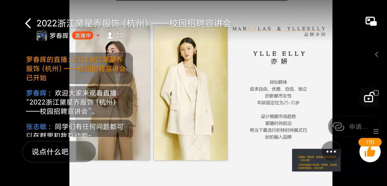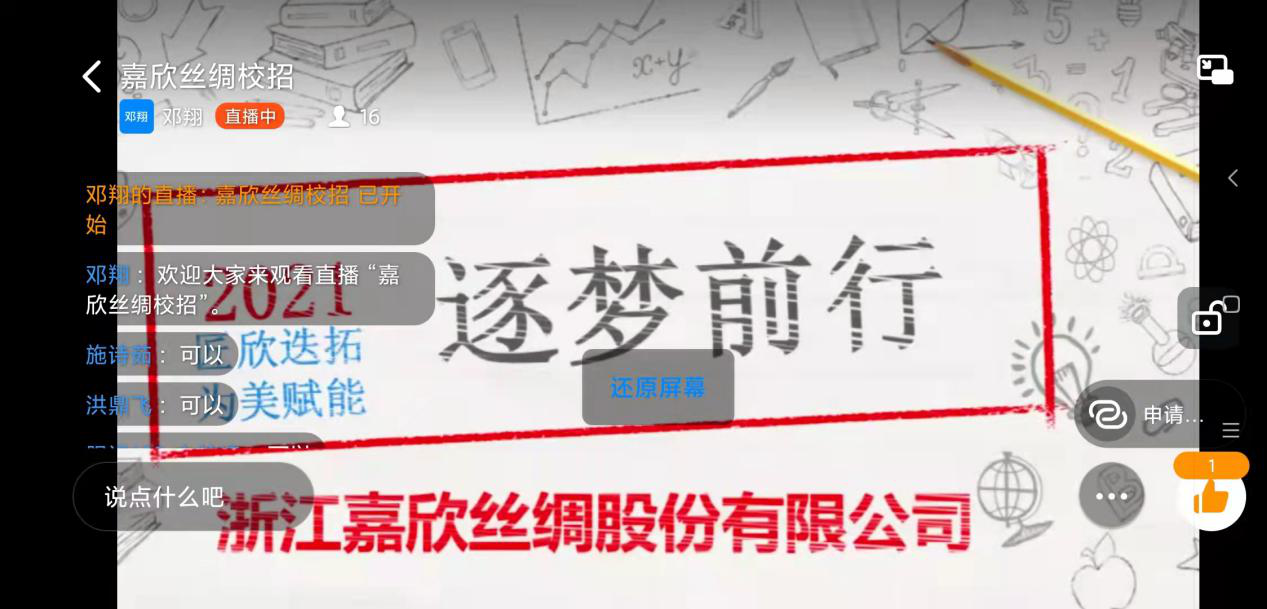 同学们一致认为:“参加线上招聘会,节约不少时间,而且企业类型多样,提供的岗位也多样,对员工来说选择余地更大。” 嘉欣丝绸有限公司招聘负责人邓总对本次招聘会的举办效果表示满意:“我司当天直播效果显著,最多在线观看人数45人,共收到有效投递简历5份。” 浙江辉吉青服饰(集团)有限公司人力资源经理胡总表示在招聘会前公司邮箱就已收到一位同学的求职简历,直播宣讲当天和这位同学经线上深入沟通,双方达成了明确意向。